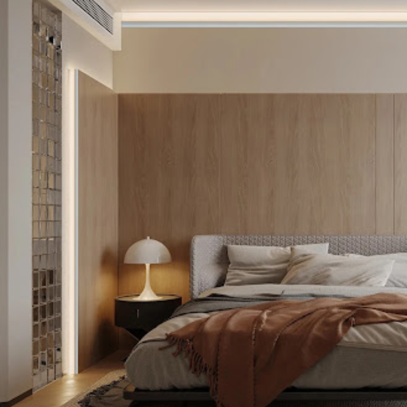 Dải led ánh sáng vàng ấm ẩn sau vách tường phòng ngủ khiến không gian trở nên sang trọng, hiện đại