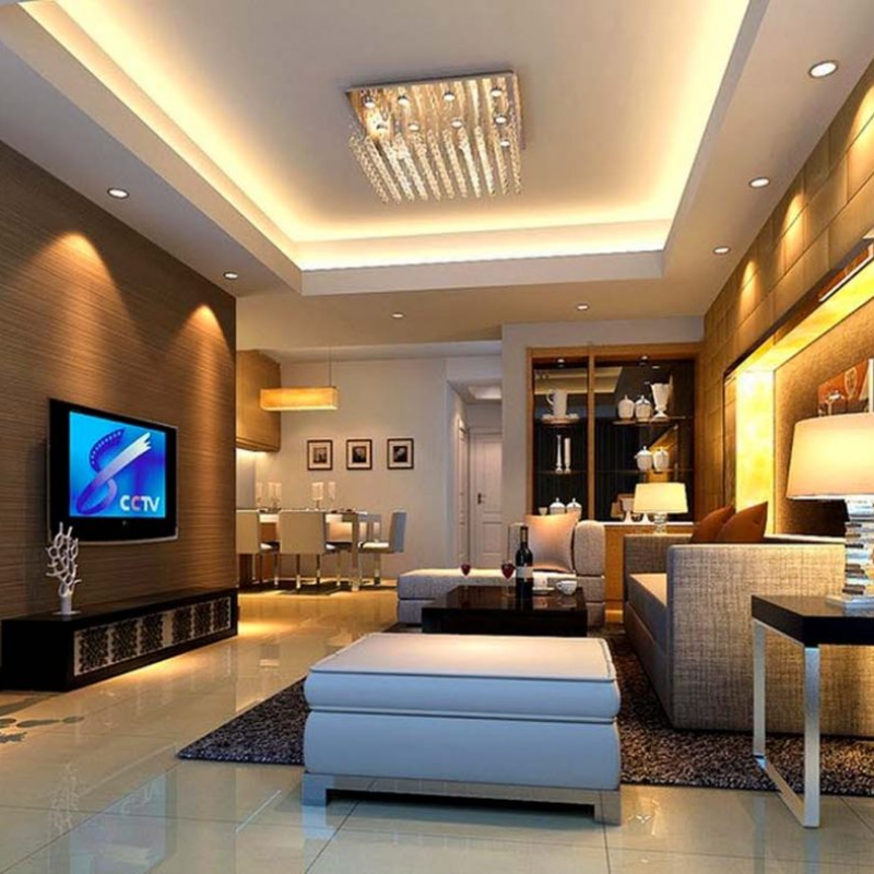Phòng khách: Phòng khách cần ánh sáng tổng thể để sinh hoạt và ánh sáng điểm để tạo điểm nhấn. Ngoài đèn trần chính, nên kết hợp đèn downlight, đèn hắt hoặc đèn trang trí. Số lượng đèn thường được chia đều để ánh sáng lan tỏa đồng đều, tránh vùng tối hoặc chói cục bộ.
