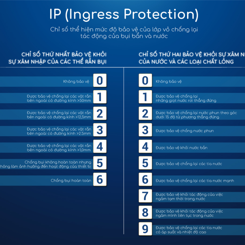 Cấu trúc ký hiệu IPXY được dùng phổ biến trên các sản phẩm đèn, trong đó X (0–6) thể hiện mức độ chống bụi, còn Y (0–9) thể hiện mức độ chống nước. Nguyên tắc chung là chỉ số càng cao, khả năng bảo vệ càng tốt, giúp ánh sáng luôn ổn định và giảm nguy cơ hư hỏng do tác động của môi trường.