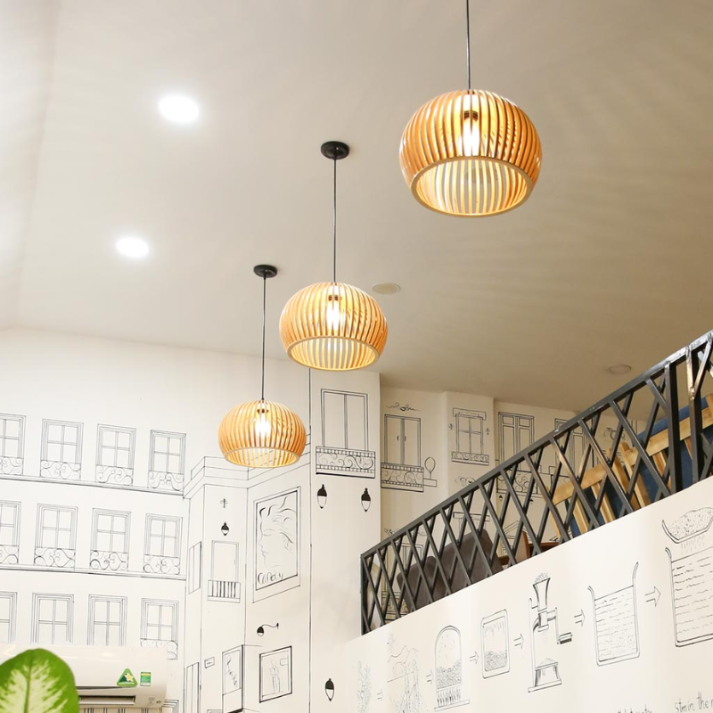 Gỗ: Gỗ mang đến cảm giác ấm áp, gần gũi và gợi sự kết nối với thiên nhiên, nhờ vào vẻ đẹp mộc mạc và vân gỗ tự nhiên đặc trưng. Chất liệu gỗ thường được sử dụng trong các thiết kế mang phong cách Scandinavian, rustic hoặc eco-friendly, nơi sự giản dị và hài hòa được đặt lên hàng đầu. Ưu điểm của đèn gỗ là khả năng tạo nên ánh sáng mềm mại, không quá chói gắt, giúp không gian thêm phần thư giãn và dễ chịu. Bên cạnh đó, gỗ có thể kết hợp tinh tế với kim loại hoặc thủy tinh, tạo nên những mẫu đèn vừa hiện đại vừa truyền thống. Với vẻ đẹp bền vững và thân thiện môi trường, đèn thả trần bằng gỗ đang ngày càng được ưa chuộng trong các căn hộ, nhà hàng hay quán cà phê mang hơi thở tự nhiên.